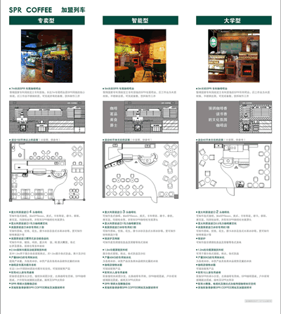 COFFEE专卖型咖啡店是更完美的完整咖啡店概念,除具备智能型咖啡店的一切优点外,更适合于单独店面运作,吧台长度由5米增加到7米,后台操作台面由木制结构升等为不锈钢结构,并且标准配备设施更完备,如增加了食品沙拉吧、冷藏柜、华夫机、比萨机、果汁机等等,不但可以提供最佳的咖啡,亦可以提供其它多种饮品,简餐品种亦可更加丰富,可以满足客人多方位的需求,因此拥有更大的利润空间。更配有可选项目:SPR专业名贵红酒库、SPR高档雪茄厅及SPR专属商务区。
